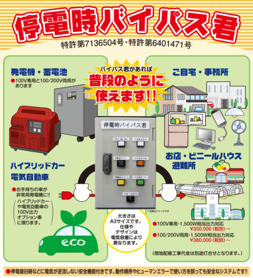 停電時バイパス君~台風、大雨、地震などの突然の停電から農作物を守ります~